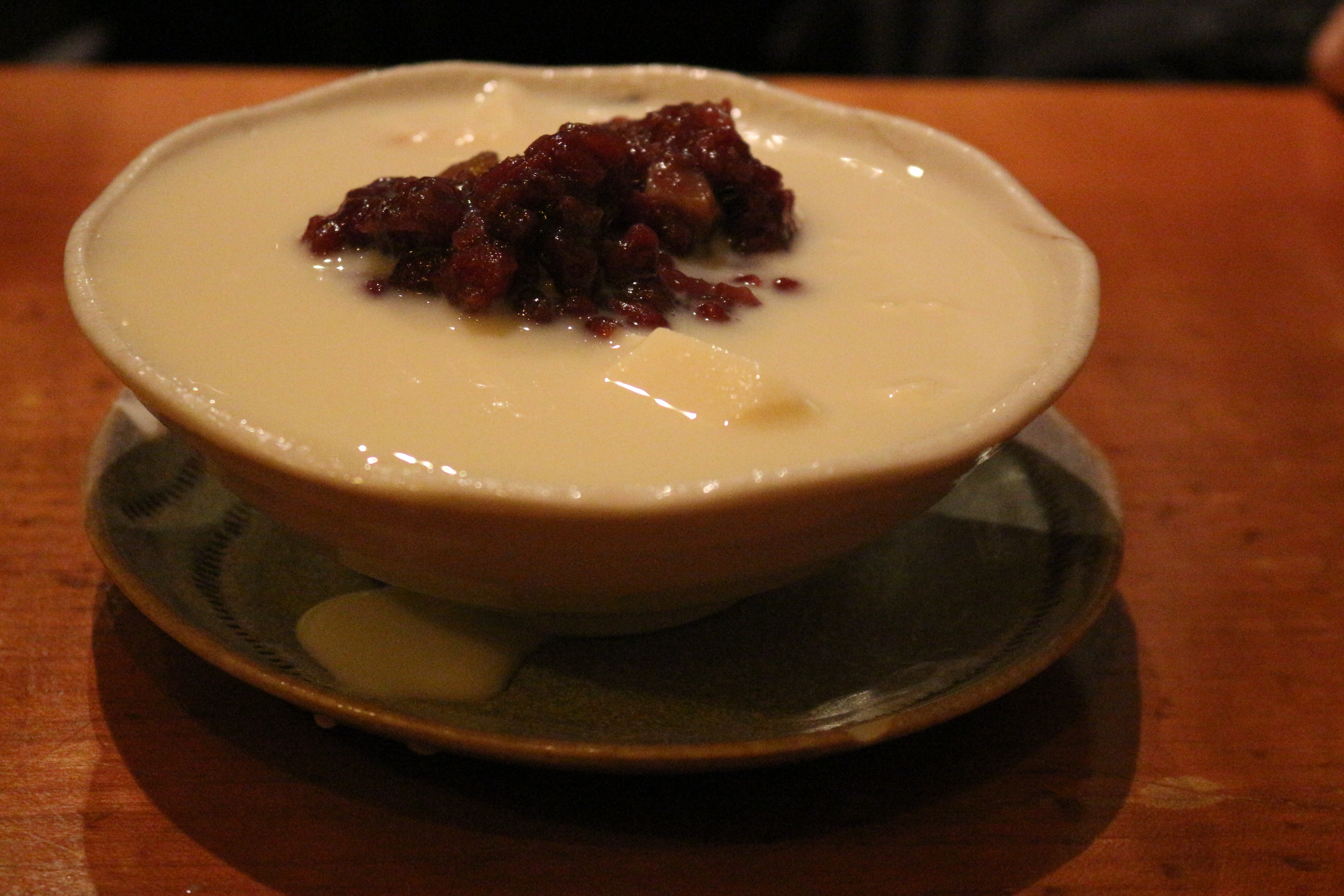 Finally, for dessert we had two custards: a warm black sesame soup and colder custard with red bean toppings. These desserts were unusual for our palettes, and difficult to finish to be honest. The black sesame soup was not very flavorful or sweet, but instead had an earthy flavor to it and the other custard was also pretty flavorless unless paired with some of the red bean topping which was the best part of the entire dessert.